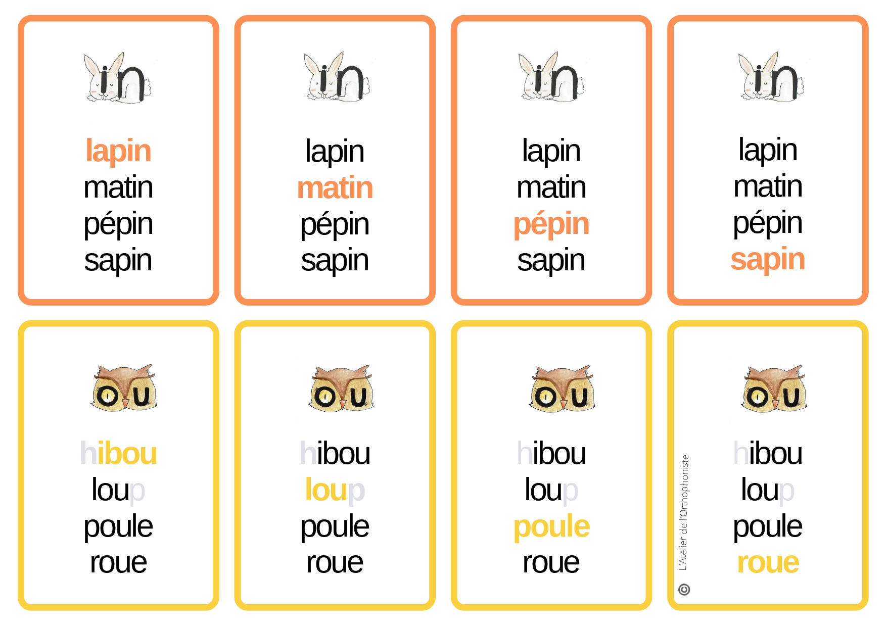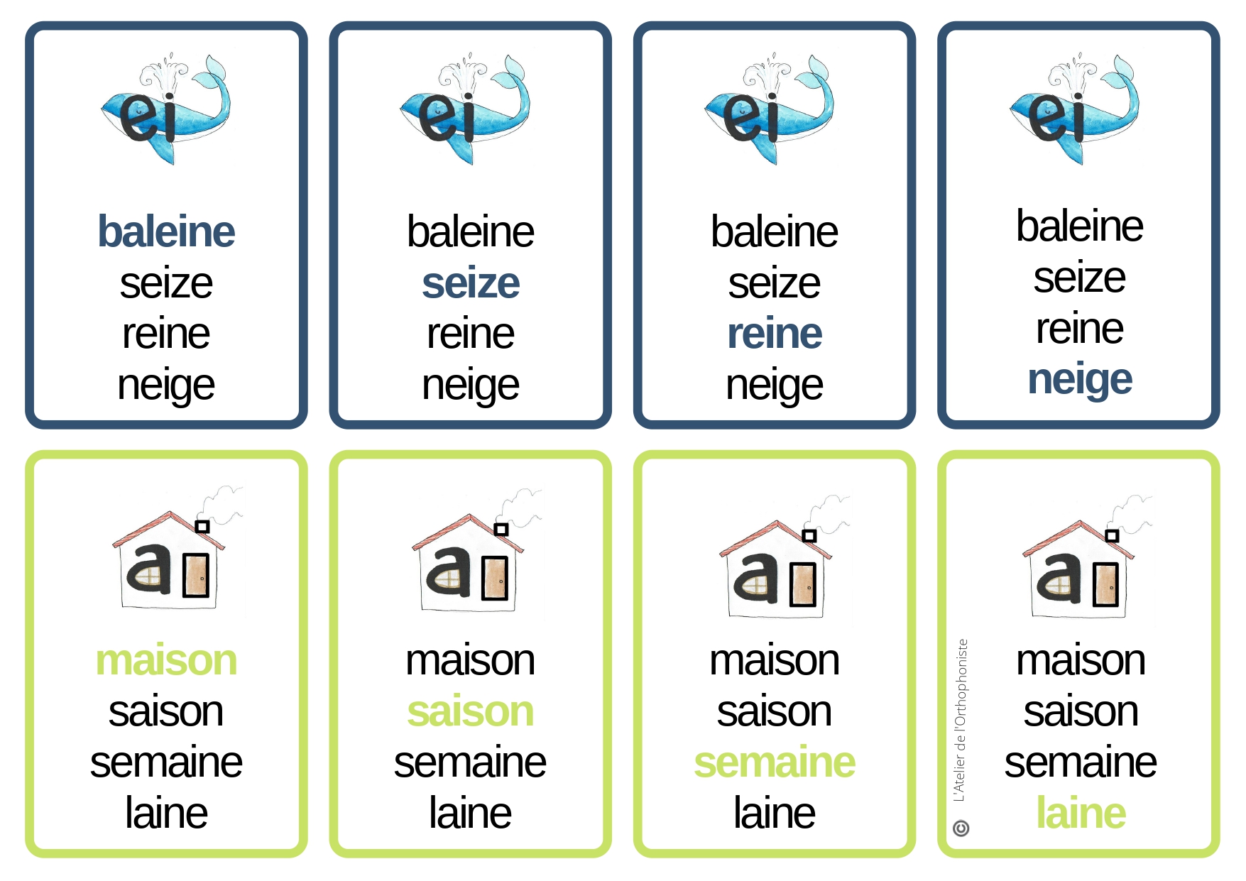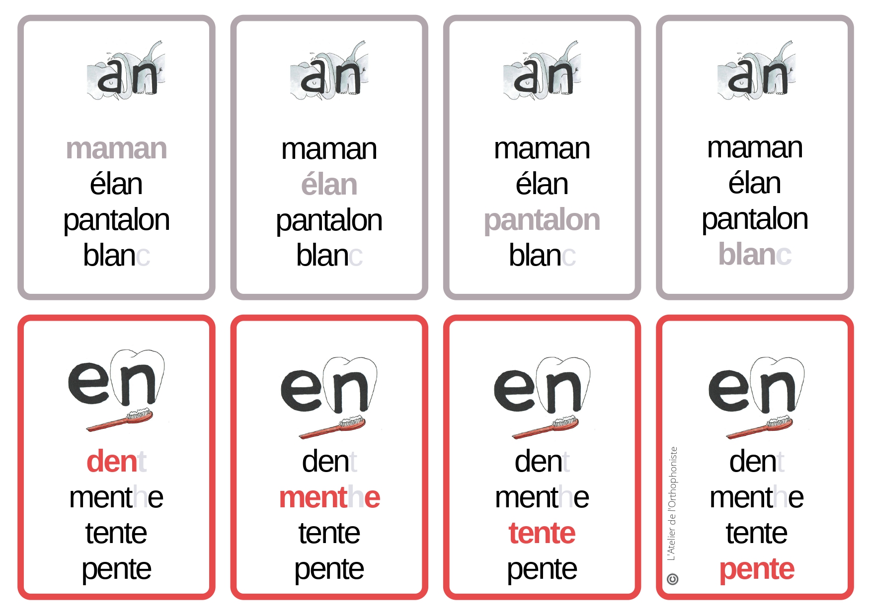 Les cartes possèdent une aide à la lecture : lettres muettes grisées pour faciliter la lecture.