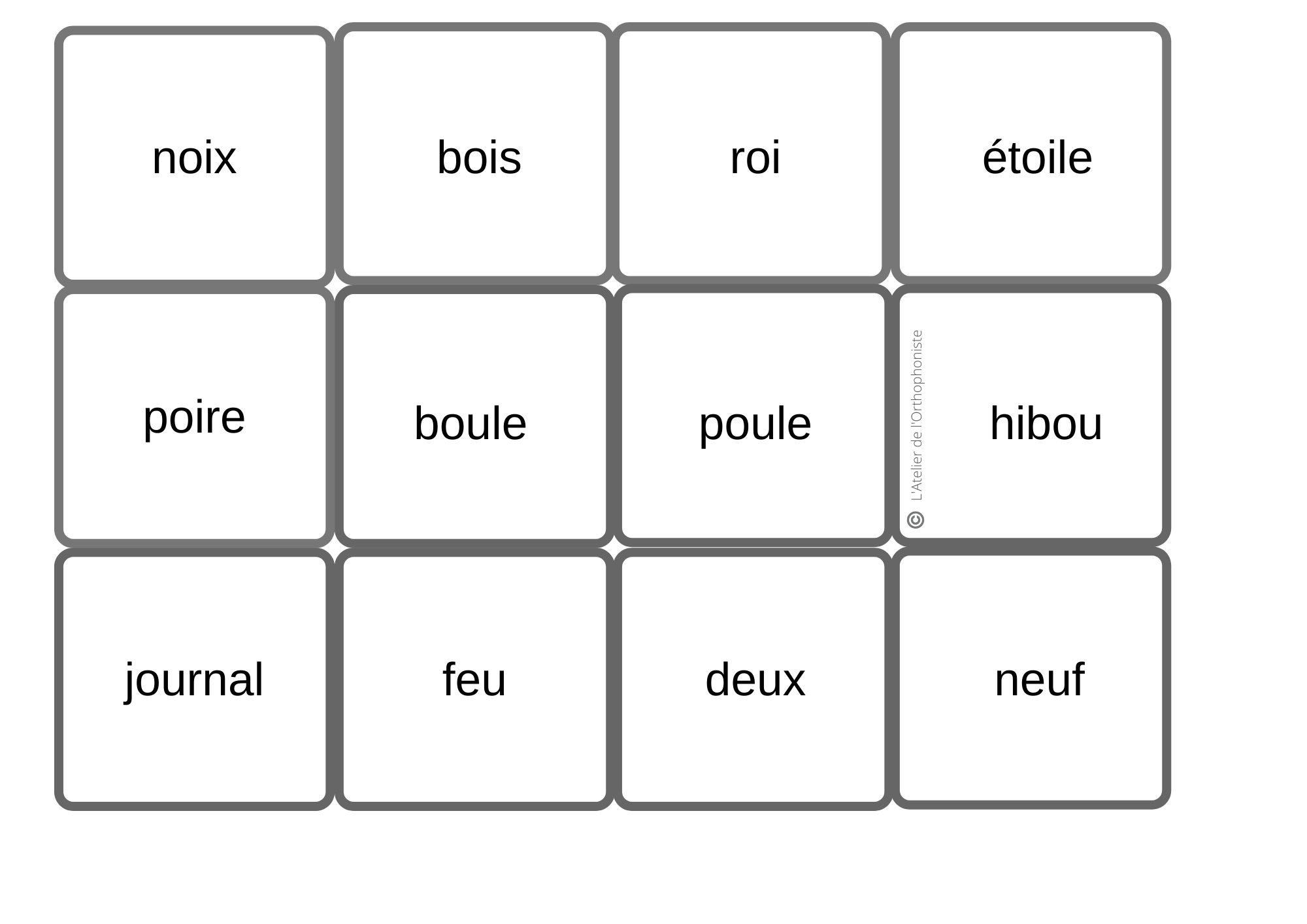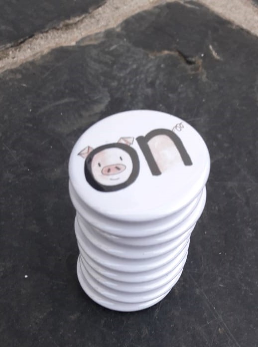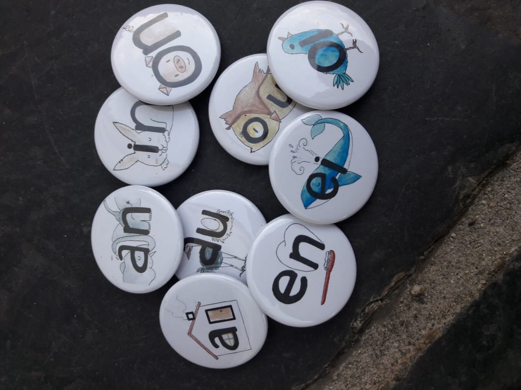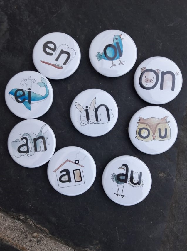 - 10 magnets représentant les 10 graphies illustrées : ou, oi, on, ei, ai, an, au, en, eu, in. Les aimants vous seront adressés par voie postale sous quelques jours (diamètre 5,5 cm).